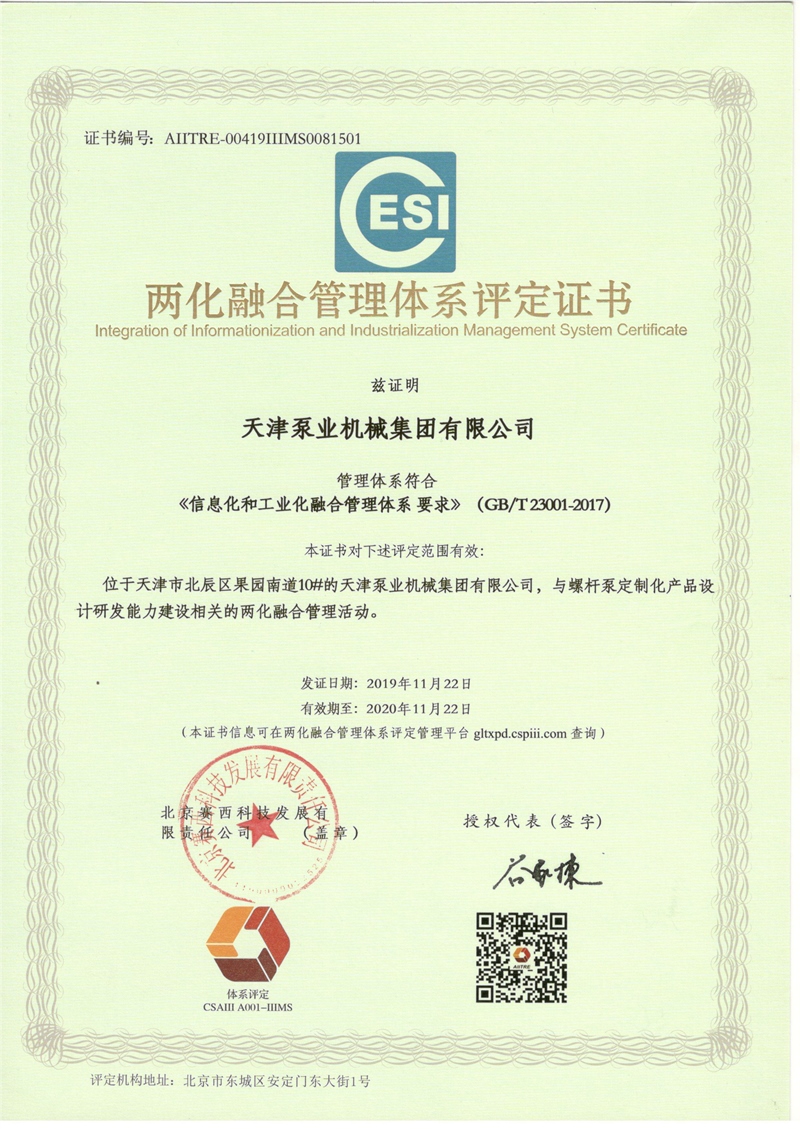 2019年11月22日,天津泵业机械集团有限公司首次通过中关村信息技术和实体经济联合发展联盟评定审批,取得《两化融合管理体系评定证书》。