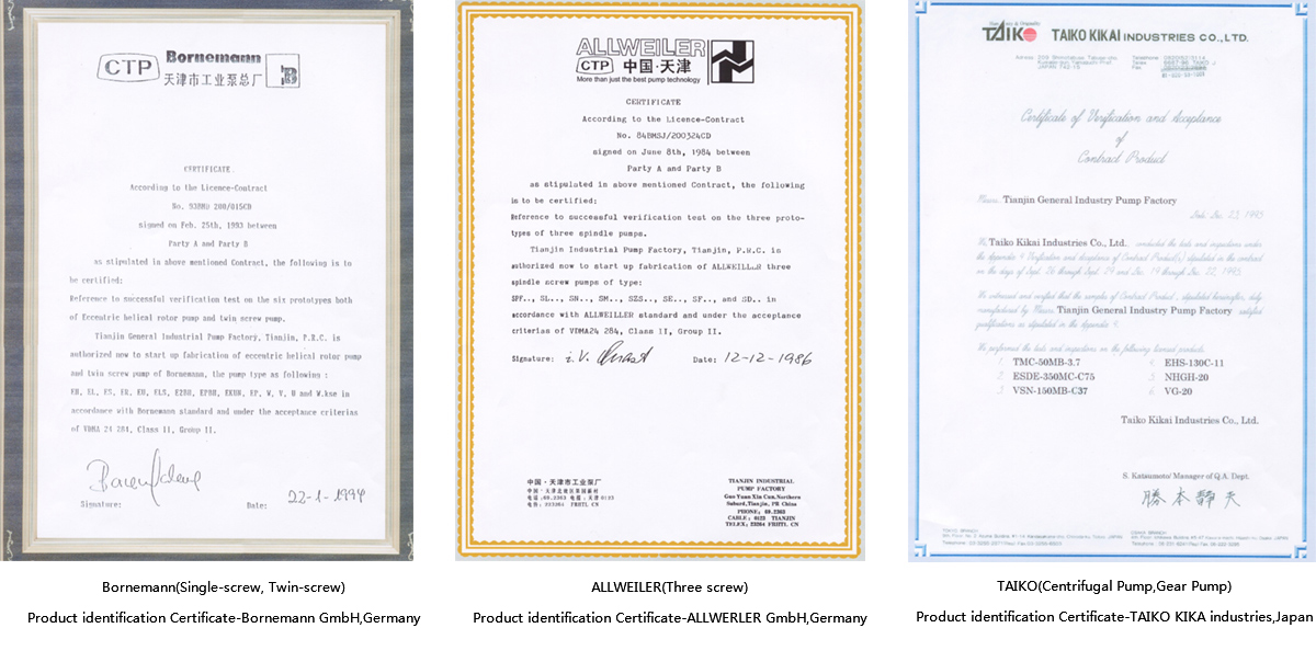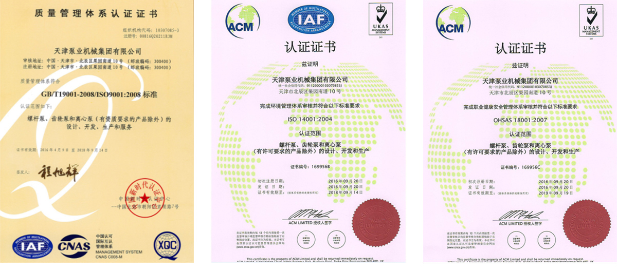 CTP became the company in Chinese pump industry that passed ISO 9001 certificate in 1994, and also the company in Chinese general machinery and pumps industry that passed National Military Quality System certificate, namely GJB/Z9001 in 1997. In 2007, CTP also passed the certificate of GB/Z 9001-2000 and GJB/Z9001A-2001, which were organized by China Xinshidai Quality System Certification Centre (XQC). All above shows that CTP’s assurance systems are quite reliable.